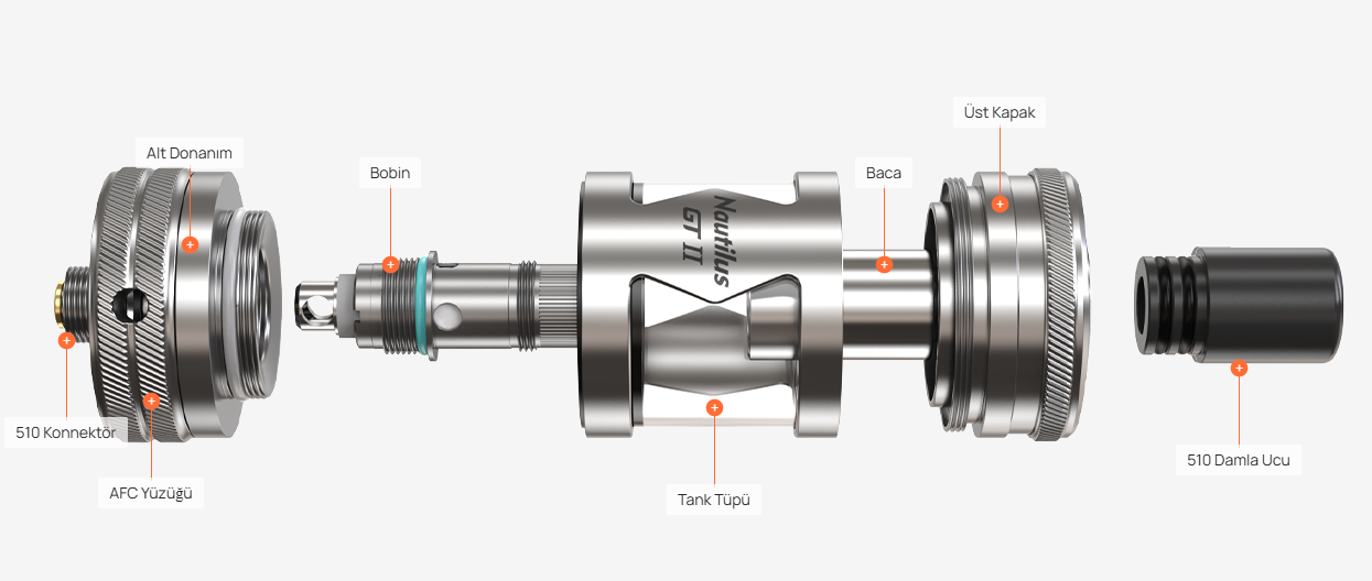 Nautilus GT II Atomizer, 4,5 ml / 2,0 ml tank kapasitesi, üstten doldurma sistemi ve alt ayarlanabilir hava akışı ile hem MTL hem RDL içim için uygundur. 510 değiştirilebilir drip tip ve tüm Nautilus serisi coil uyumluluğu sayesinde yoğun aroma ve esnek kullanım sunar.