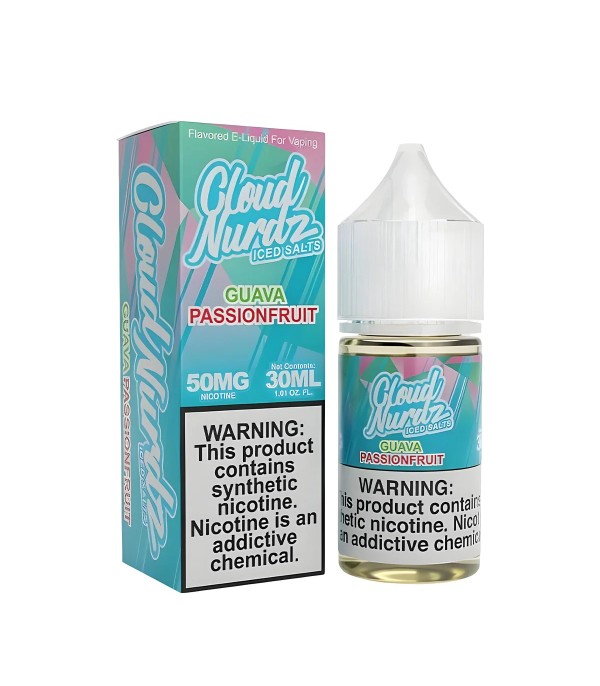 Cloud Nurdz Guava Passion Fruit Iced Salt Likit, tropik guava ve tutku meyvesi aromalarını buz ferahlığıyla birleştirir. 30 mL, 25 mg / 50 mg nikotin seçenekleri, 60VG/40PG oranı.