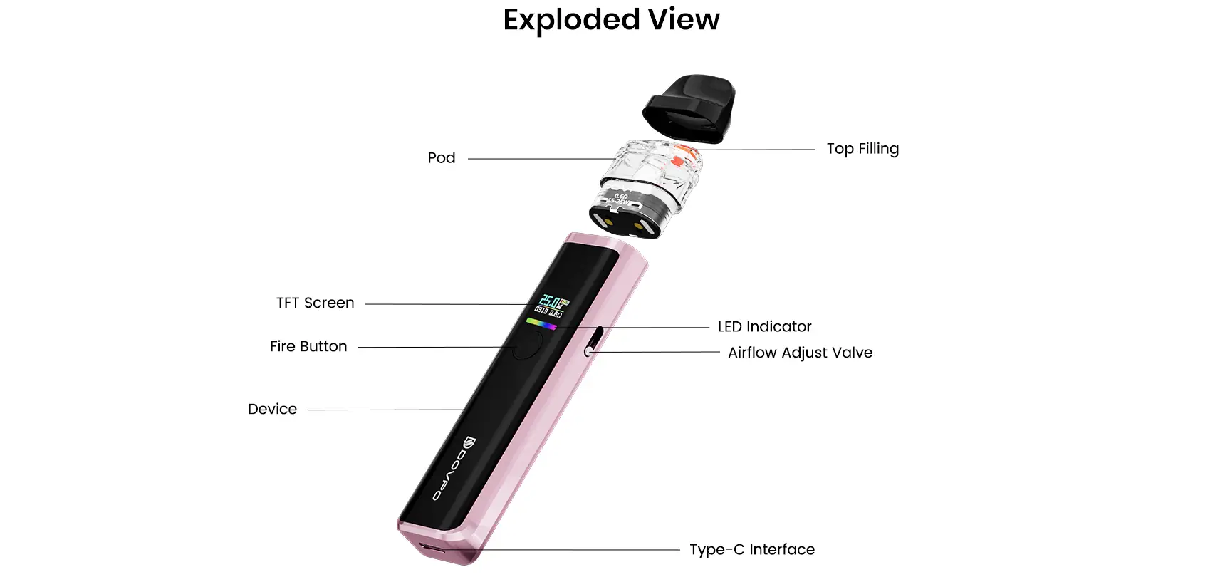 Dovpo Ayce Mini Pod, 1000mAh dahili bataryası ve 5-25W güç çıkışı ile hem aroma hem buhar odaklı içim tarzlarını destekleyen kompakt bir pod cihazdır. 0.6 Ohm ve 0.8 Ohm mesh coil pod seçenekleri, USB-C hızlı şarj ve sızdırmaz yapı ile kullanım kolaylığı sağlar. Estetik panel seçenekleriyle günlük kullanım için ideal bir tercih.