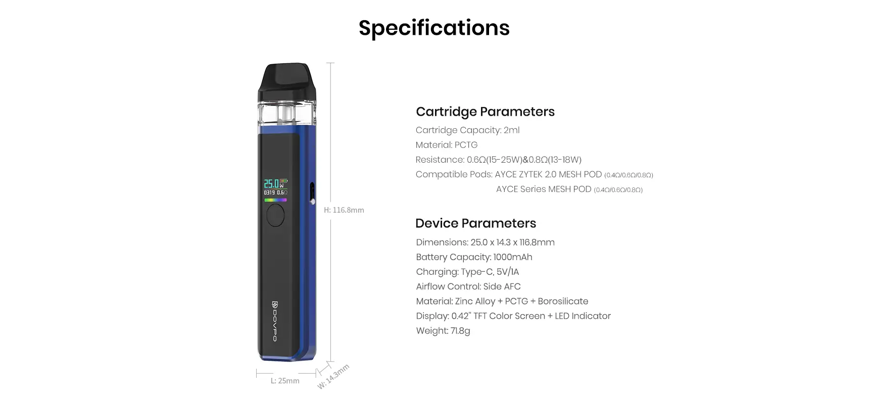 • Pod Direnç Seçenekleri: 0.4 Ohm, 0.6 Ohm, 0.8 Ohm
