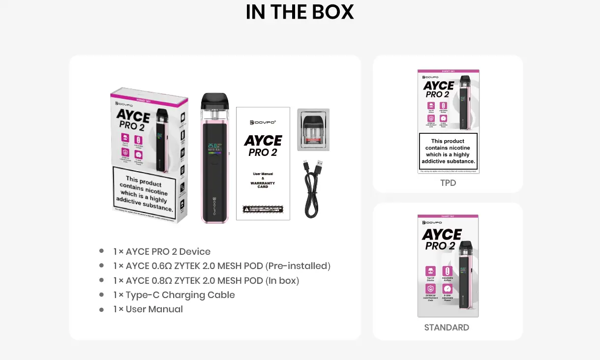 Dovpo AYCE Pro 2 Pod Kit, 1000mAh bataryası, 5-30W güç çıkışı ve 0.4-0.6-0.8 Ohm ZYTEK 2.0 mesh pod seçenekleri ile hem aroma hem buhar performansını dengede tutar. 2ml pod kapasitesi, üstten dolum ve yan hava akışı kontrolü ile kullanım kolaylığı sağlar. USB-C şarj ve renkli TFT ekranıyla hem görselliğe hem işlevselliğe önem veren kullanıcılar için güçlü ve stil sahibi bir tercih.