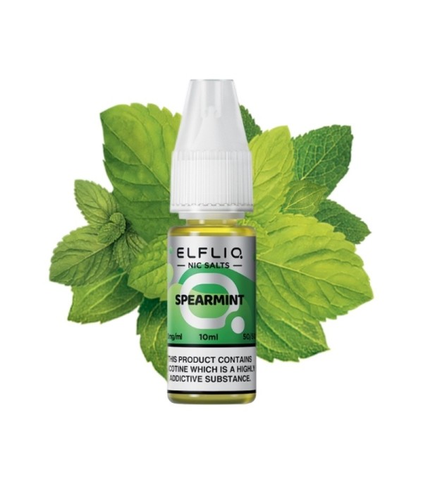 Elfliq Spearmint Salt Likit 10ml, taze nane yapraklı e-likit şişesi.