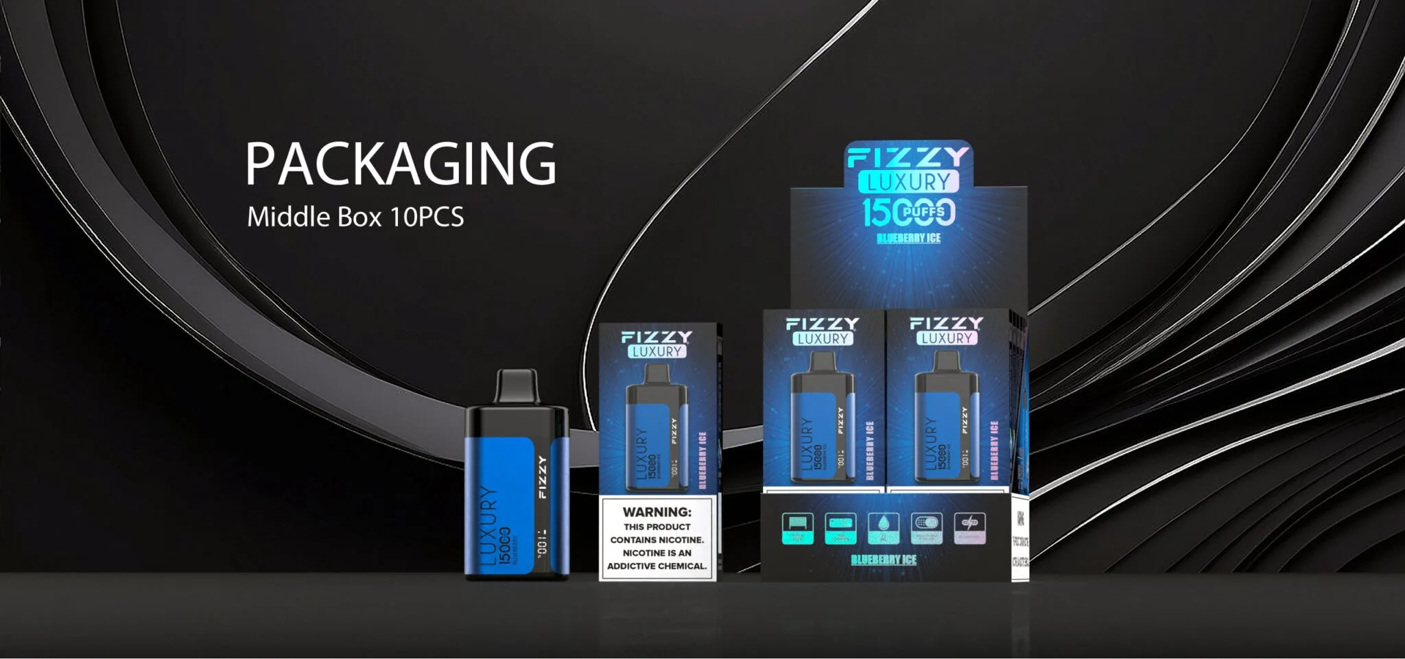 Fizzy Luxury 15000 Puffs Disposable Vape, premium metal gövdesi, mesh coil teknolojisi ve özelleştirilebilir hava akımı ile tat ve buhar yoğunluğunu dengede tutmak isteyen kullanıcılar için tasarlanmış üstün bir cihazdır. 22 mL e-likit kapasitesi, LCD ekranı ve nabız deliği taşıma halkası sayesinde hem şık hem de fonksiyonel bir kullanım sunar.