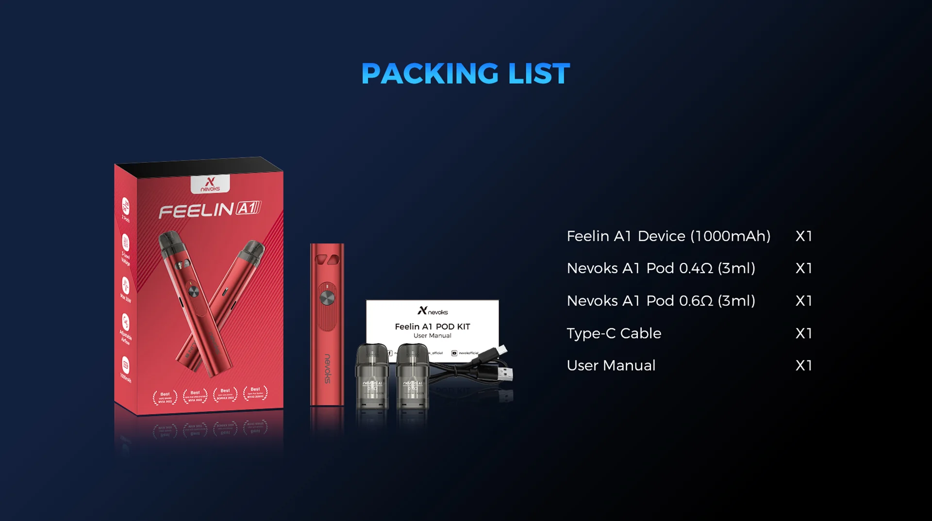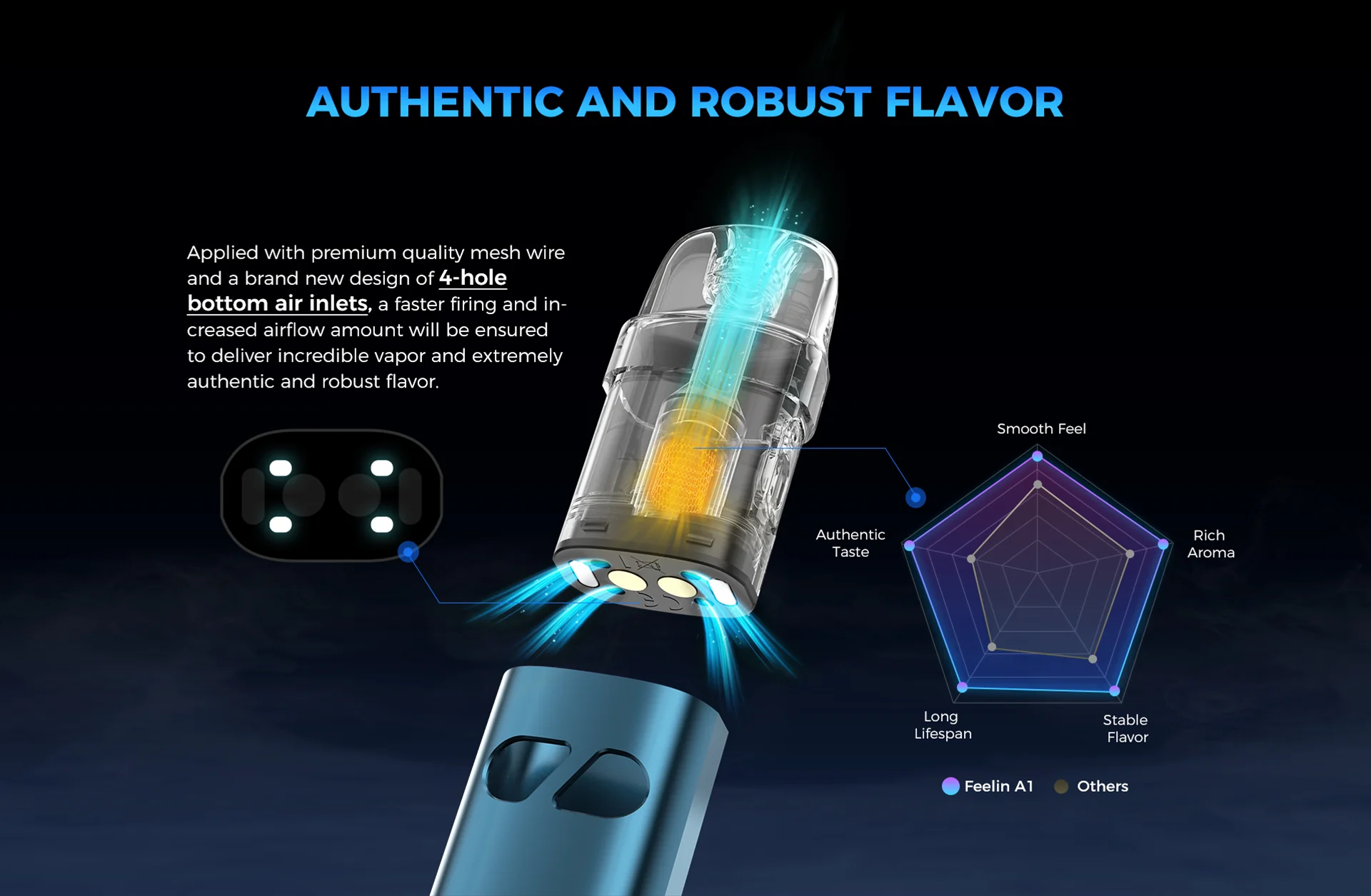Feelin A1, hem yeni başlayanlar için kolay kullanım sunar hem de sıklıkla dışarıda olan ve taşınabilir, pratik cihaz arayan deneyimli kullanıcılar için mükemmeldir. 30W çıkışı ve 2.6 ml pod kapasitesi ile aroma ve buhar dengesini korur.