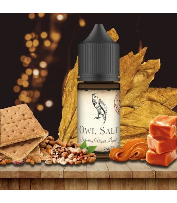 Owl Salt Likit şişesi, karamel, kuruyemiş ve tütün yaprağı ile.