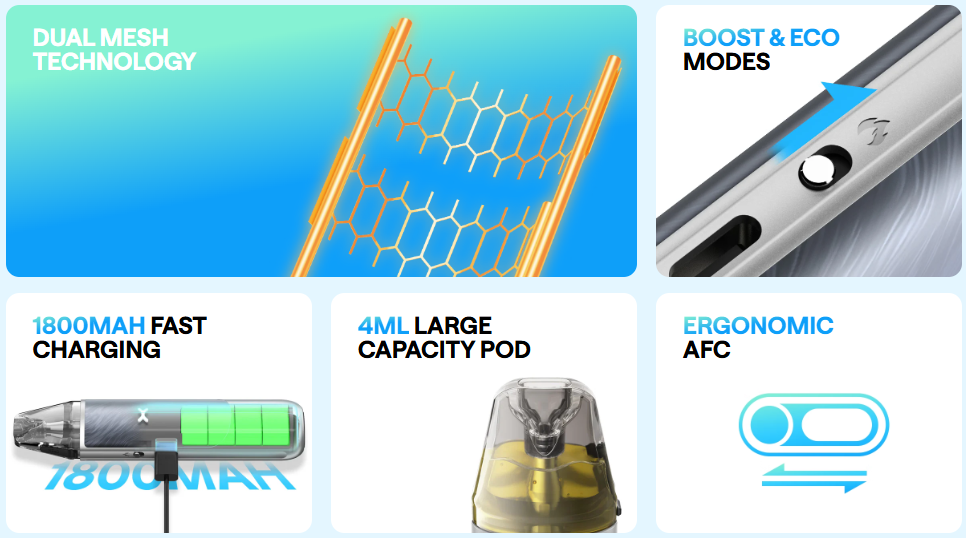 OXVA NeXlim Pod Vape Kit, 1500mAh bataryası, dual mesh coil seçenekleri (0.6 Ohm / 0.8 Ohm / 1.2 Ohm), Boost ve Eco modları ile hem aroma hem buhar performansını arayanlar için dengeli bir cihazdır. Kaydırılabilir hava akışı, sızdırmaz pod sistemi ve renkli ekran ile pratik kullanım ve görsel çekicilik sağlar.