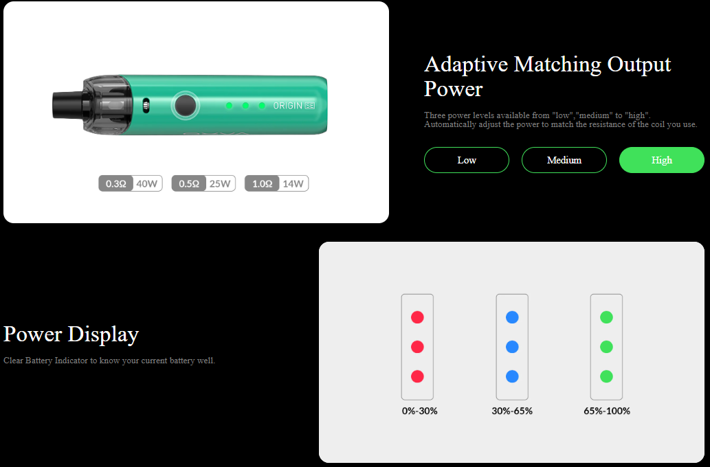 OXVA Origin SE Pod Kit, 1400mAh dahili bataryası, 5–40W ayarlanabilir güç çıkışı ve Unicoil sistemini kullanarak 0.3 Ohm, 0.5 Ohm ve 1.0 Ohm direnç seçenekleriyle zengin aroma ve anti-sızıntı deneyimi sunar. Ayarlanabilir hava akışı, otomatik çekim (auto-draw) ve manuel butonlu kullanım seçenekleriyle kişisel içim tarzınıza uyum sağlar. 2A hızlı şarj desteğiyle sadece 30 dakikada %80'e kadar şarj olabilir.