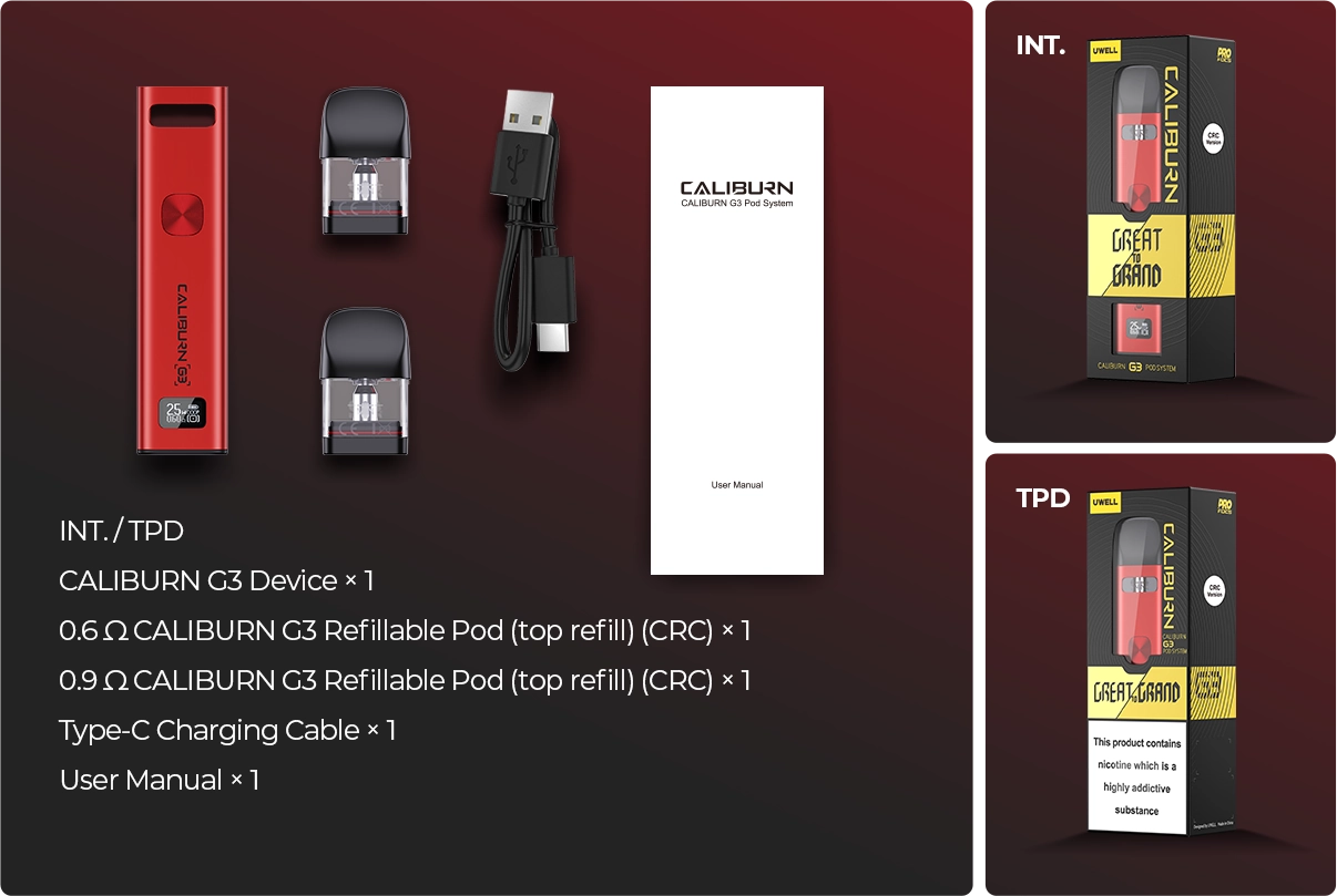 Uwell Caliburn G3 Pod Mod, son derece popüler Uwell Caliburn G serisi MTL pod mod sistemlerinin en son üyesidir ve dahili 0,60 Ohm coile sahip kartuşu ile ybenzersiz bir aroma yoğunluğu ve kusursuz bir boğaz vurumu sunar. Uwell Caliburn G3 Pod Mod, bir OLED ekrana, dahili 900 mAh bataryaya ve üç ateşleme moduna sahiptir: tetik düğmesi kilit modu, nefes sensörü veya her ikisi. Yedek Uwell Caliburn G3 pod kartuşları, MTL ve RDL kullanımları için 0.6 Ohm, 0.9 Ohm ve 1.2 Ohm (Çok Yakında) dirençlerde mevcuttur.