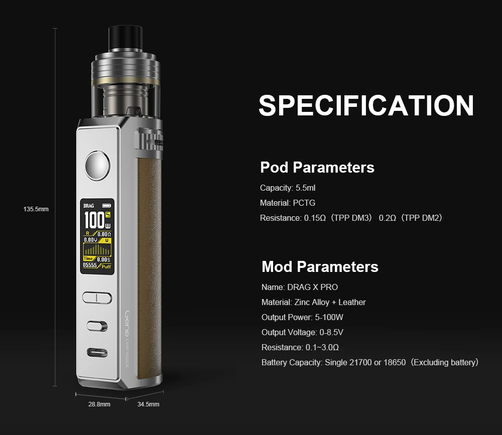 Voopoo Drag S Pod Mod60W’a kadar güç çıkışı sağlar. Ayrıca, deri ve metalin kusursuz birleşimi sayesinde hem dayanıklı hem de şık bir görünüm kazanmıştır.