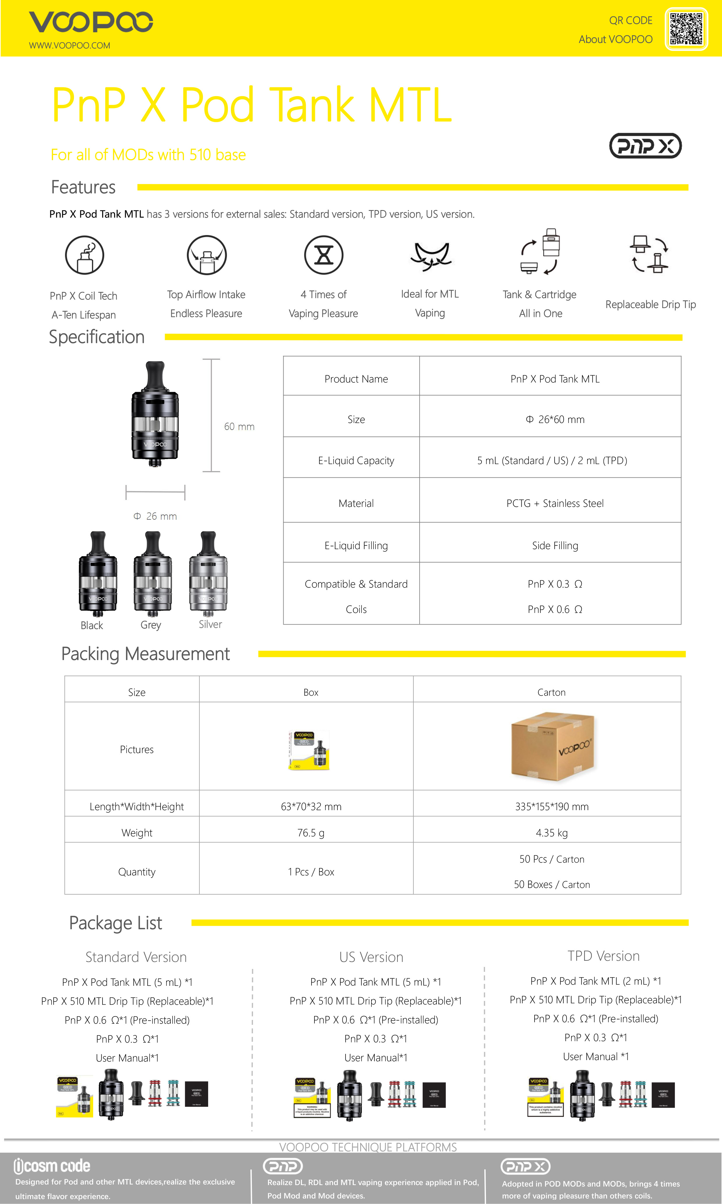 VooPoo PnP-X Pod Tank: 5.0ml sızdırmaz yan dolum, çift alt hava akışı ve 510 taban ile geliştirilmiş aroma ve buhar performansı sunar. Popüler PnP Coil Serisi ile tam uyumlu bu tank, yoğun MTL/DL deneyimi için idealdir. Yüksek performanslı VooPoo tankınızı hemen keşfedin!