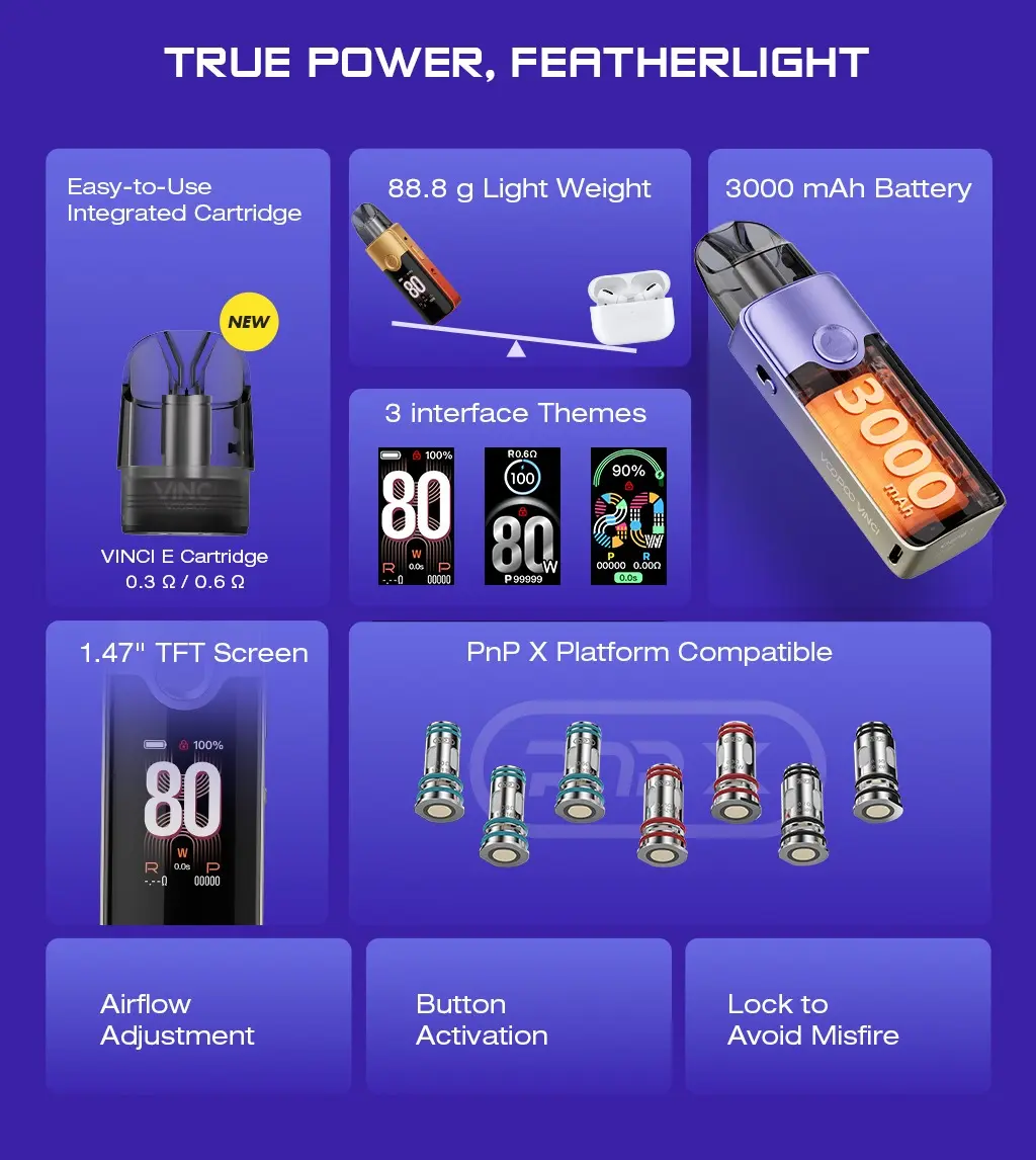 Voopoo Vinci E80 Pod Kit, 3000mAh güçlü bataryası ve 5-80W çıkış gücü ile hem aroma hem buhar performansında elit bir deneyim sunar. 1.47" renkli TFT ekran, sızdırmaz mesh pod’lar (0.3 Ohm, 0.6 Ohm, 0.8 Ohm) ve ayarlanabilir hava akışı sayesinde MTL, RDL ve DTL içim tarzlarını tek cihazda yaşarsınız. USB-C hızlı şarj desteği ve hafif gövdesi ile günlük kullanımda konforlu ve güvenilir bir tercihtir.